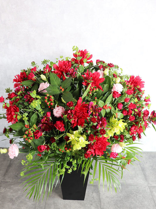 背を高め赤系おまかせ豪華アレンジ