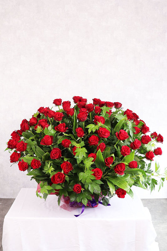 華やかさあふれるピンク&レッドのラウンドアレンジ