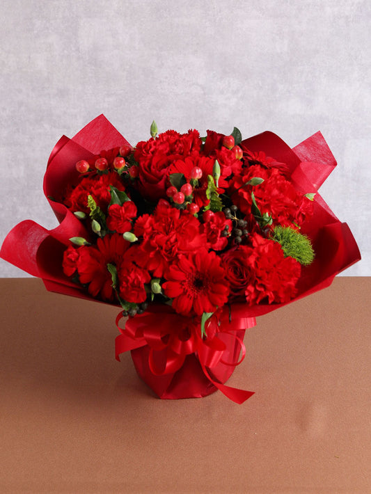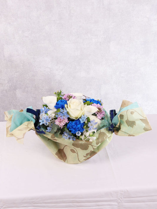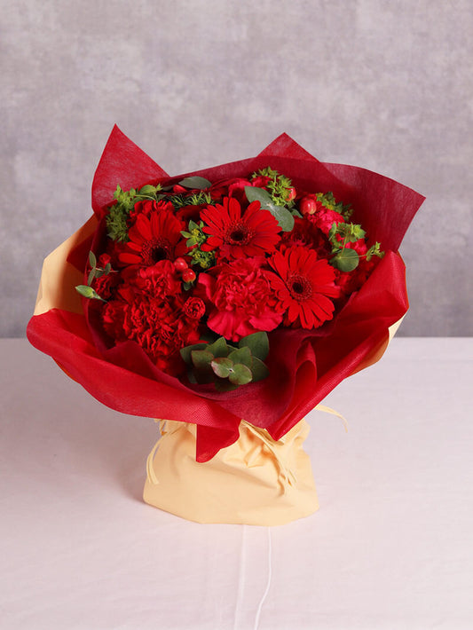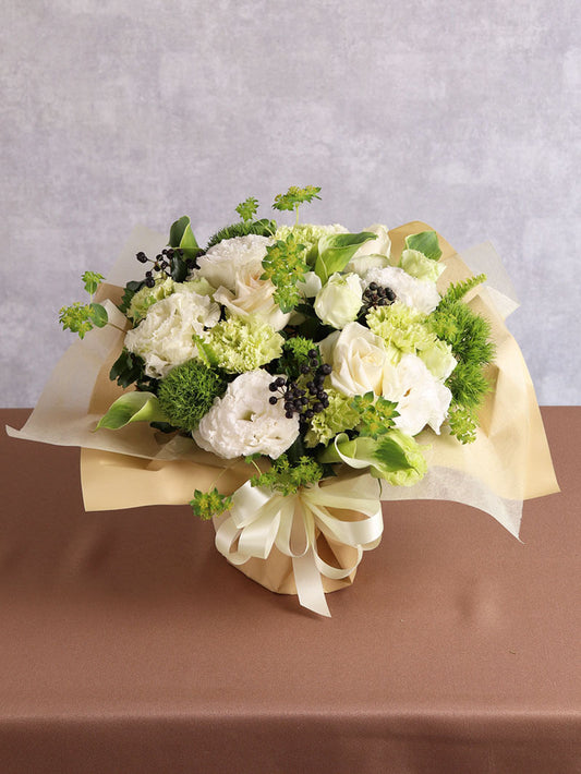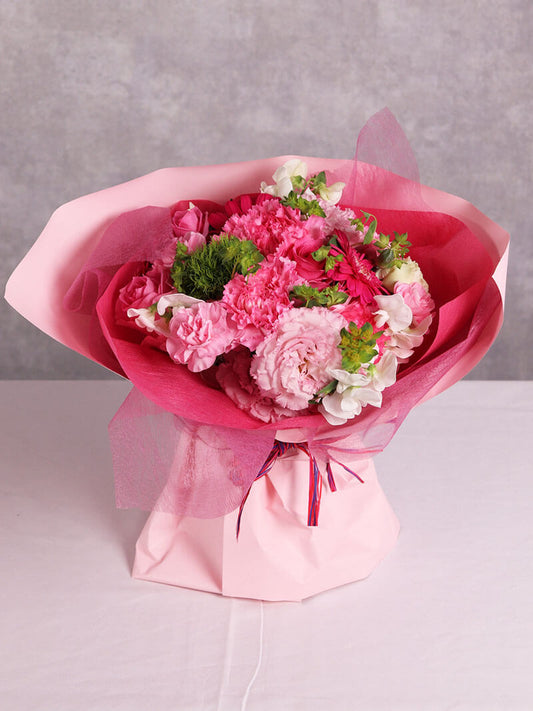 当店では、カーネーションはもちろん、優雅なバラやナチュラルなグリーンを添えたアレンジメントなど、多彩な花々をご用意しました。