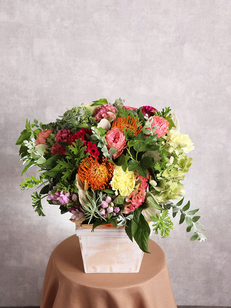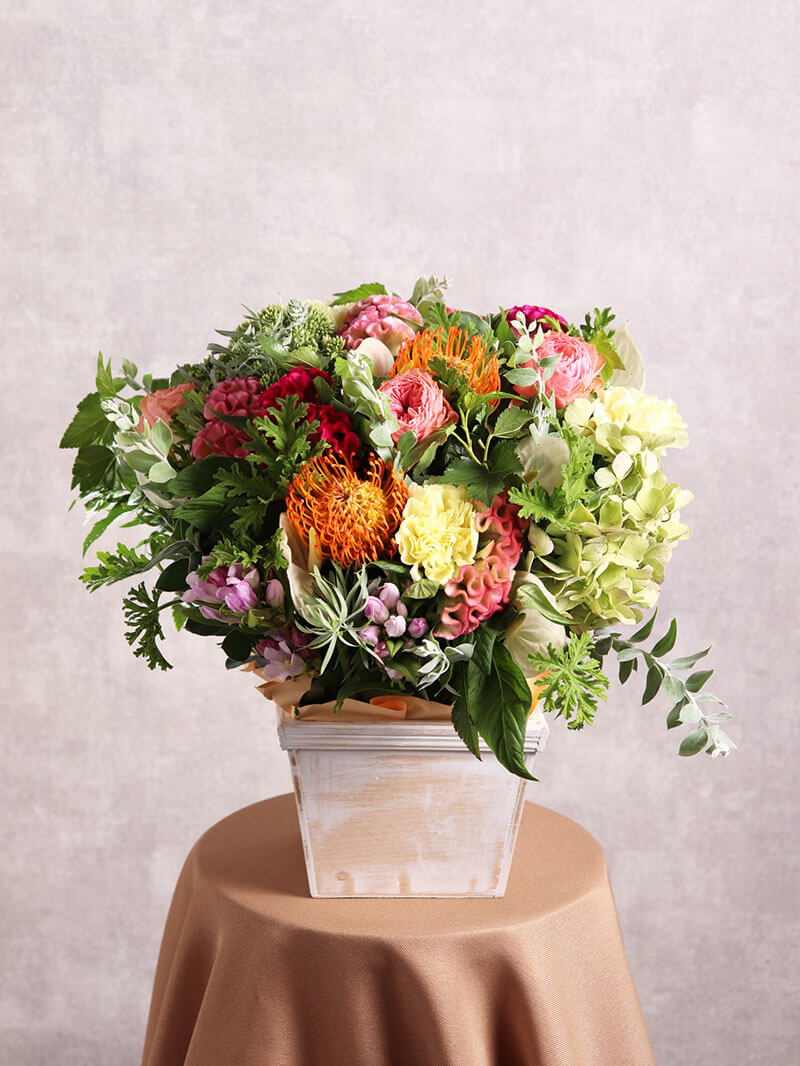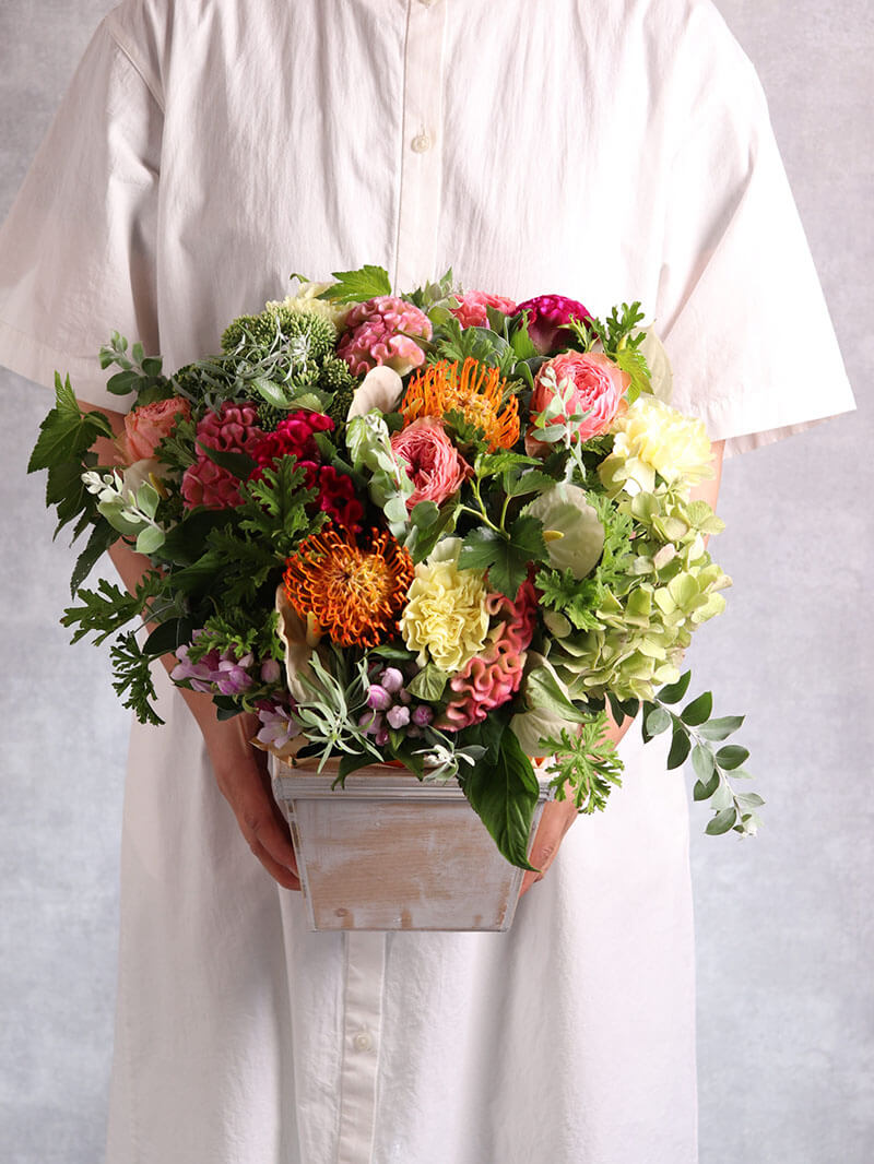 *お届け日はご希望としての承りとし、災害等の影響で遅延が生じる場合があることをご了承の上でご注文ください。 *一部地域への配送はご希望日時に添えない場合もあることをご了承ください。 *送料・決済方法・不在時対応等について、ご注文前にご利用案内をご一読・ご理解の上、ご注文ください。 *使用する花は、季節により発色や大きさが写真と異なる場合がございます。また、天候や仕入れの状況により変更する場合もありますが、ボリューム感や雰囲気は掲載写真にそうよう配慮いたします。花の仕入れは制作・発送の直前に決定するため、花の内容変更について事前にご連絡をすることが難しい場合があることを予めご了承ください。 *商品によっては、時期により仕入れ不可能な場合がございます。その際、速やかに弊社よりご連絡させていただきます。 *商品に納品書(商品の価格が記載されたもの)は一切同梱いたしません。 *領収書をご入用の際は、マイページの注文履歴より表示できます。 *1回のご注文でお届けできる住所は1箇所のみです。 *お届け先の住所が複数の場合は別々にご注文ください。