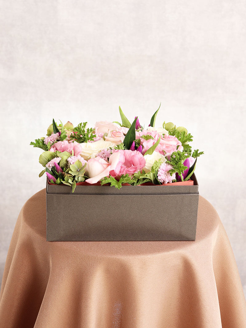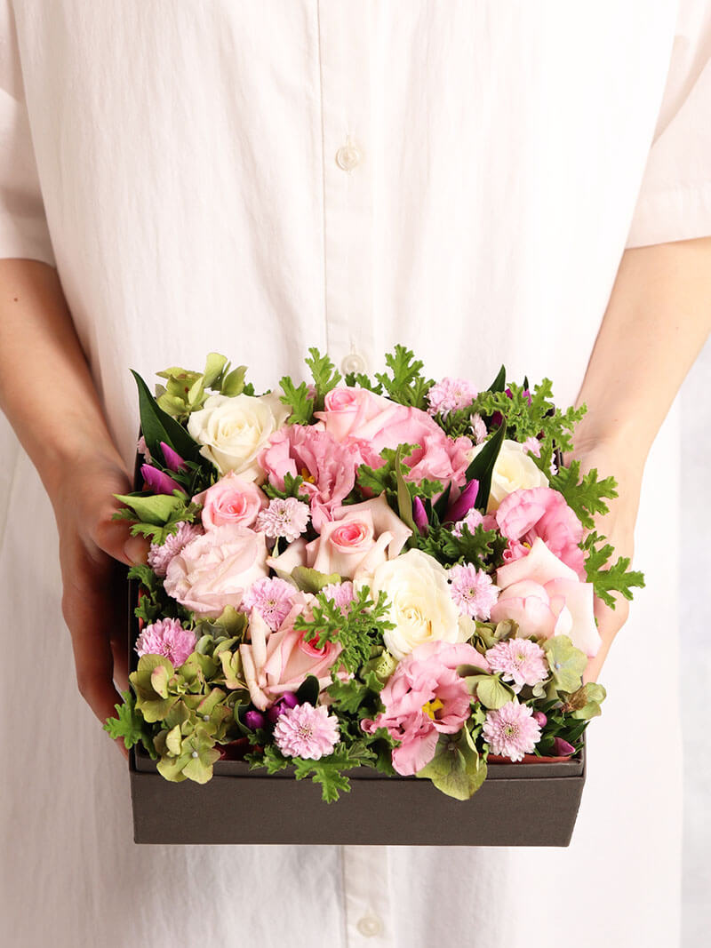 やわらかなピンクとホワイトを基調にした上品なボックスフラワーです。フタを開けると大人かわいい色合いが華やかで、贈る方の気持ちを優しく届けてくれます。コンパクトながら存在感があり、誕生日や記念日、お祝い事など幅広いシーンにぴったり。箱に入っているためサプライズや、そのまま飾れて手間がかからないのも魅力です。東広島市の花屋「ますかわ花店」より、心を込めてお届けいたします。※季節の花を使用してピンク系で制作いたします