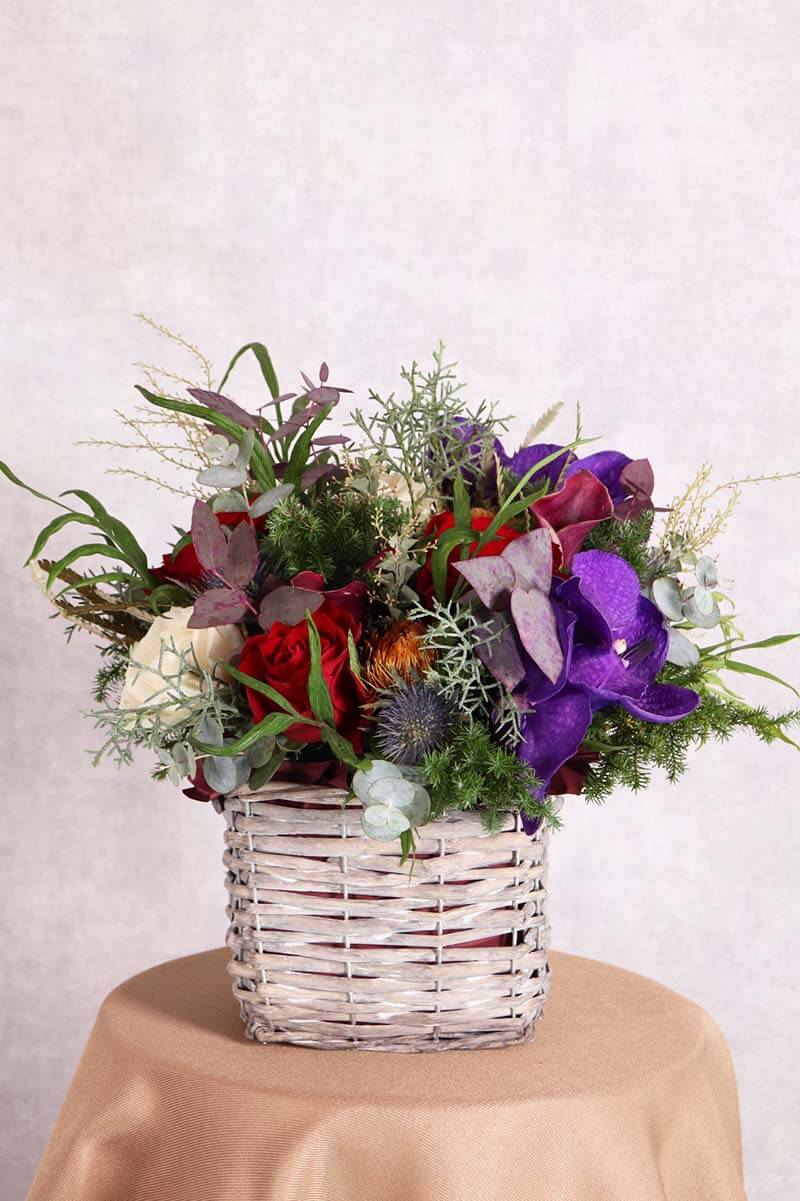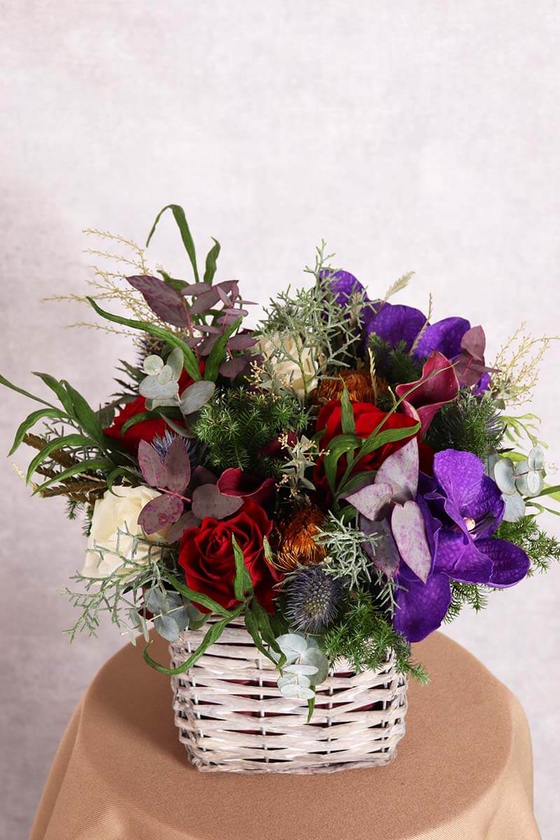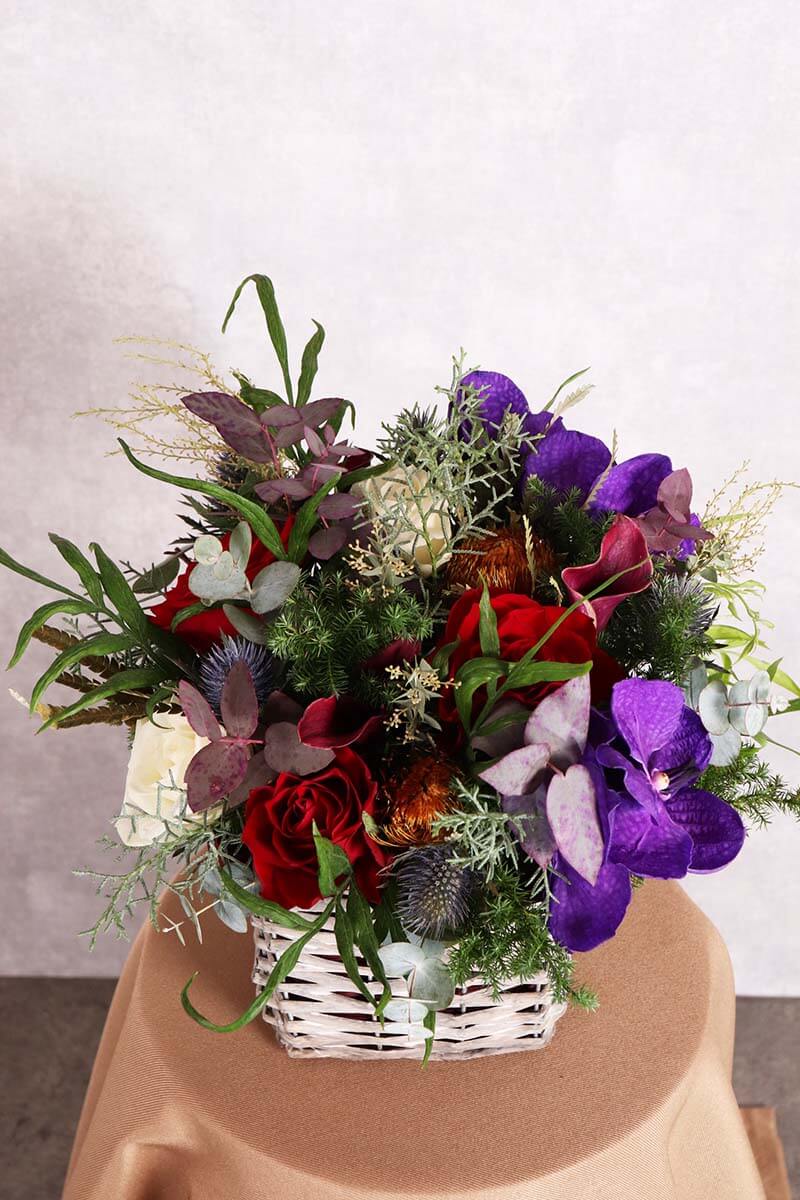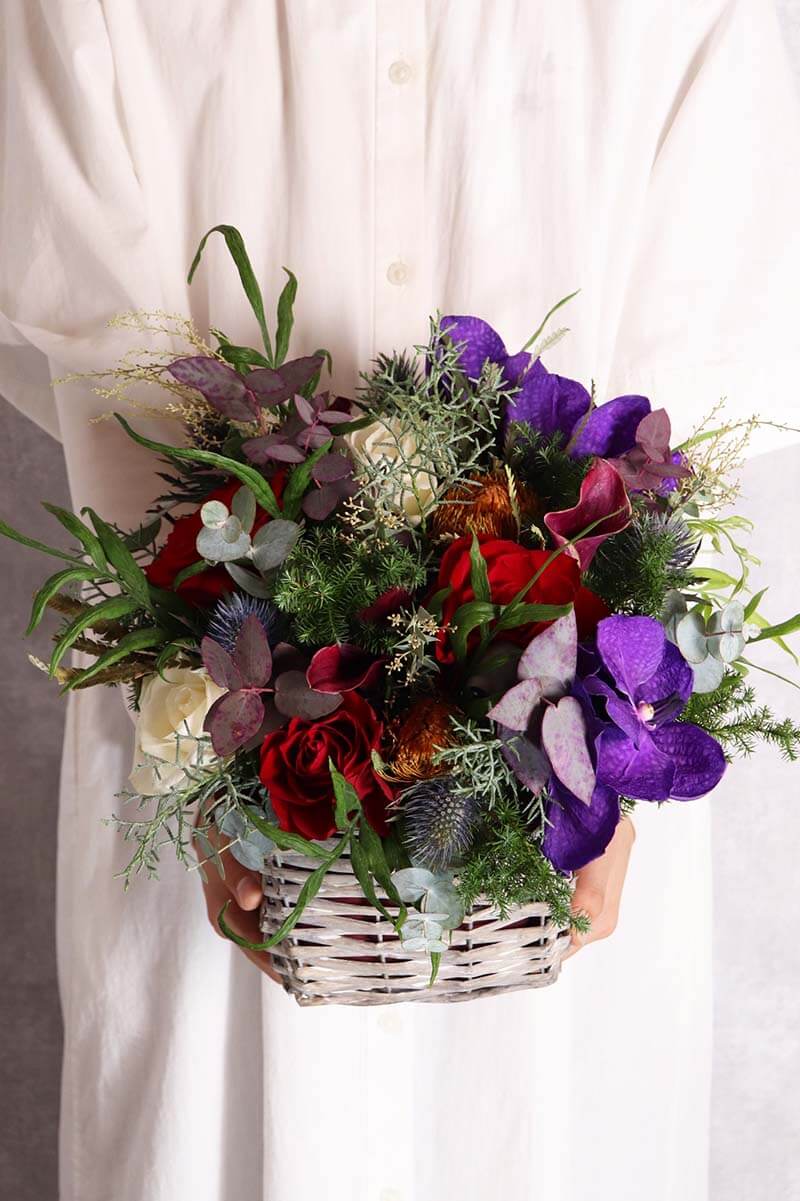 華やかな赤と深みのある紫が印象的な、クリスマスシーズンにぴったりのフラワーアレンジです。クリスマスでは定番の葉物やお花を入れ、上品なバスケットに彩り豊かにお花をあしらい、落ち着きの中にも特別感を演出しました。ご自宅のインテリアや大切な方への贈り物にもおすすめです。東広島市の花屋「ますかわ花店」が心を込めてお届けいたします。