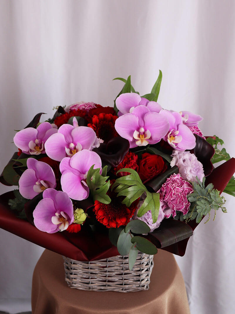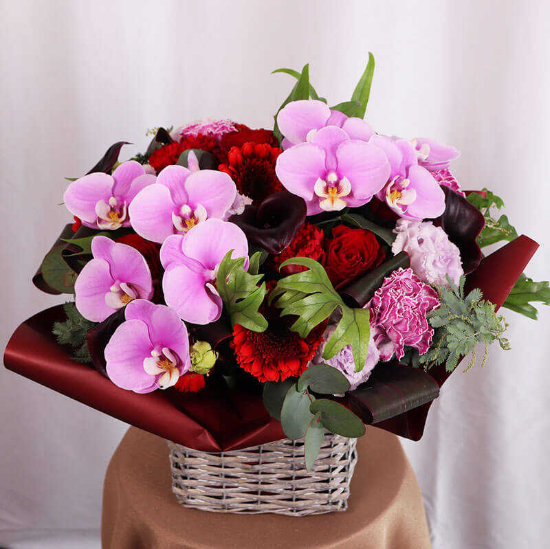 雅やかな色合いを主役に、和モダンの魅力を上品に仕上げたアレンジメントです。鮮明な彩りと柔らかな質感が調和し、空間に凛とした華やかさを添えます。和の趣を感じさせる落ち着いた雰囲気は、お祝い事や贈り物にも最適。東広島市の花屋「ますかわ花店」が、心を込めて丁寧におつくりいたします。※赤・ピンクを中心に和モダン風に制作します。花材は季節によって変わります