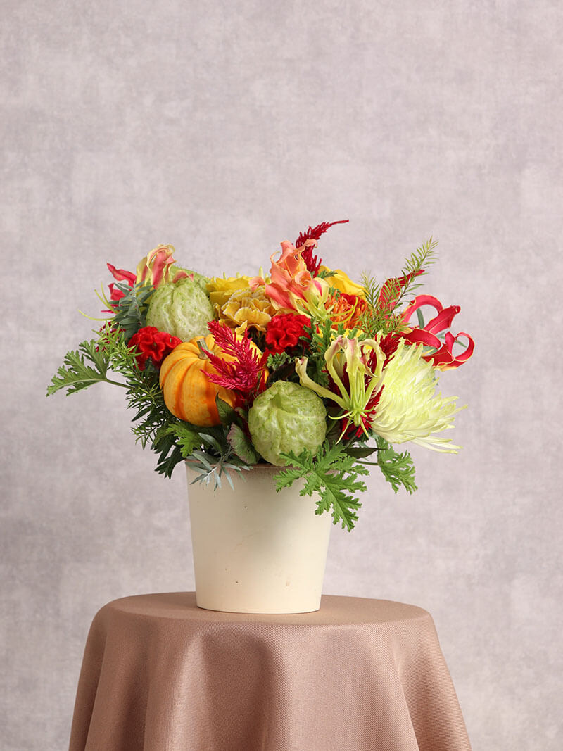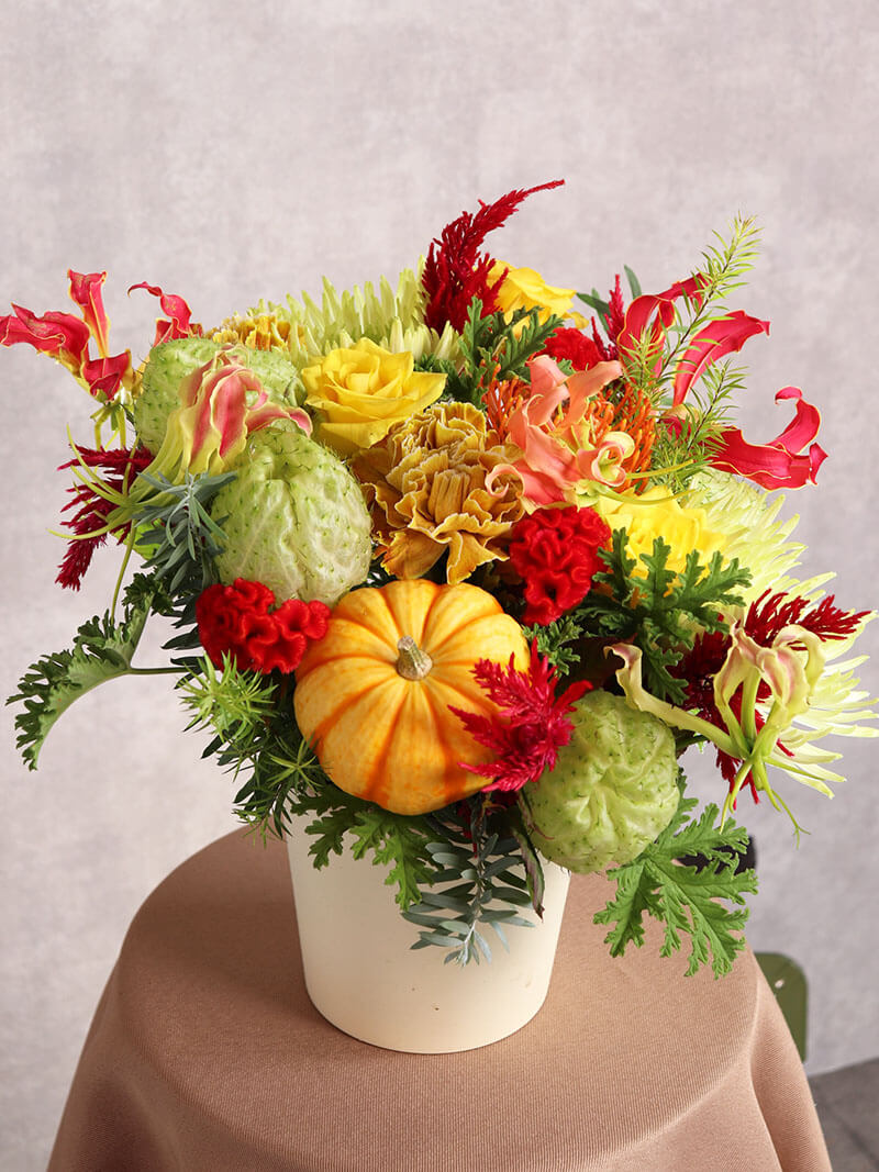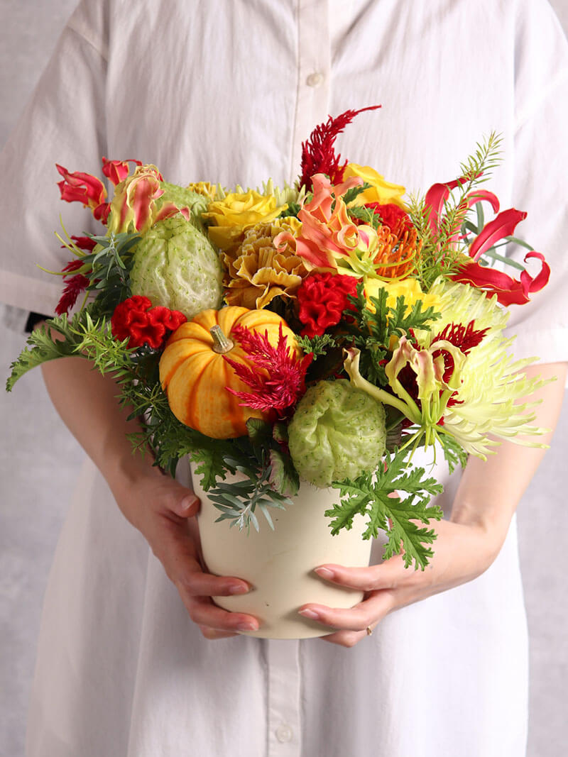 秋の彩りをたっぷり詰め込んだ、ハロウィンおすすめのおまかせアレンジです。オレンジやイエローを基調に、季節の実物やグリーンをバランスよくあしらい、温かみのある華やかな印象に仕上げました。ご自宅のインテリアやギフトにもぴったり。東広島市の花屋「ますかわ花店」が、秋の訪れを感じる特別なアレンジメントを心を込めてお届けします。