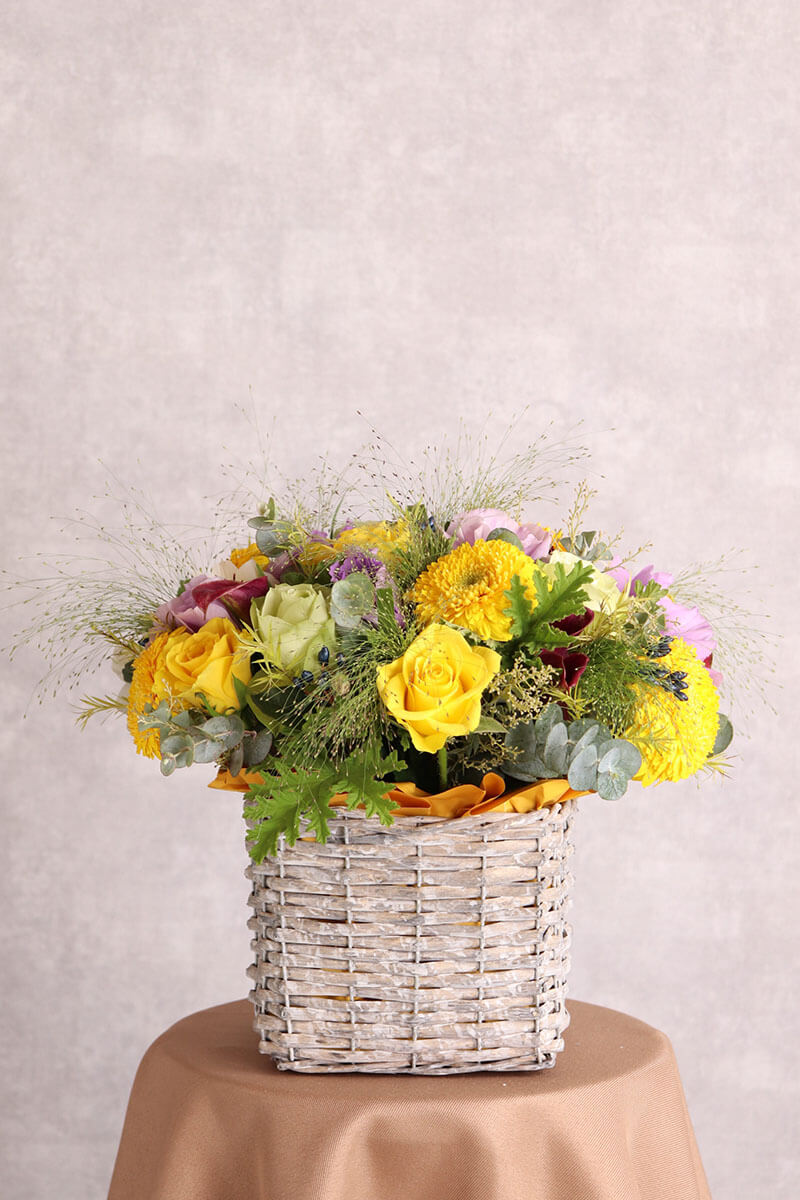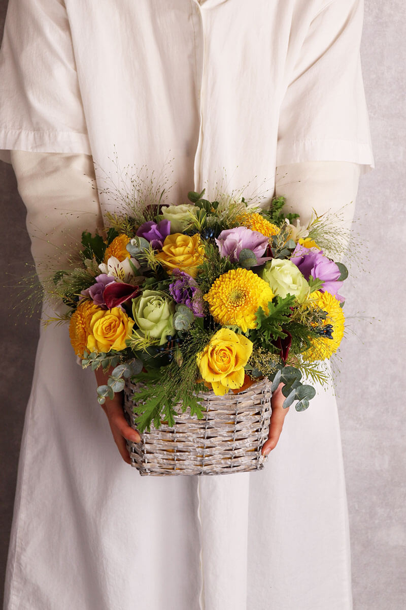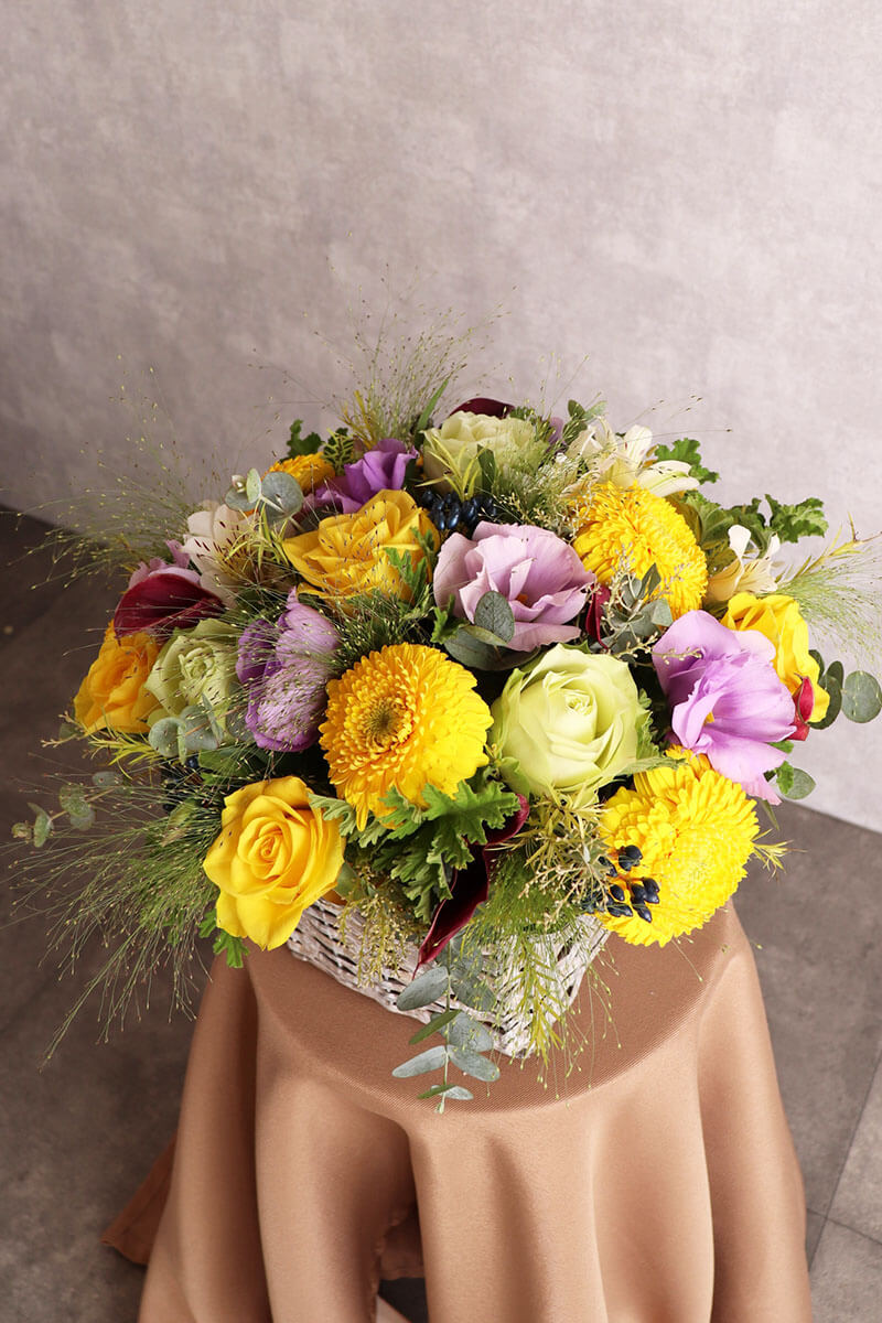明るいイエローとやわらかなパープルのコントラストが、まるで春の陽だまりのように優しく心を照らすフラワーアレンジです。上品でありながら明るく華やかな雰囲気があり、お祝いや贈り物にぴったりで、東広島市の「ますかわ花店」がお届けする、心温まる一品です。大切な方へのプレゼントやご自宅の彩りにぜひどうぞ。※花材は季節により異なります。画像の様に制作いたします。