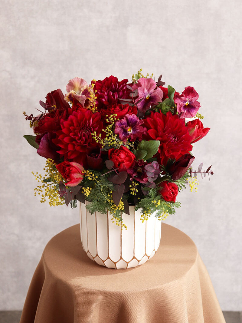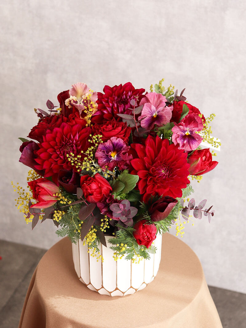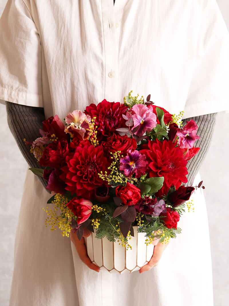 *お届け日はご希望としての承りとし、災害等の影響で遅延が生じる場合があることをご了承の上でご注文ください。 *一部地域への配送はご希望日時に添えない場合もあることをご了承ください。 *送料・決済方法・不在時対応等について、ご注文前にご利用案内をご一読・ご理解の上、ご注文ください。 *使用する花は、季節により発色や大きさが写真と異なる場合がございます。また、天候や仕入れの状況により変更する場合もありますが、ボリューム感や雰囲気は掲載写真にそうよう配慮いたします。花の仕入れは制作・発送の直前に決定するため、花の内容変更について事前にご連絡をすることが難しい場合があることを予めご了承ください。 *商品によっては、時期により仕入れ不可能な場合がございます。その際、速やかに弊社よりご連絡させていただきます。 *商品に納品書(商品の価格が記載されたもの)は一切同梱いたしません。 *領収書をご入用の際は、マイページの注文履歴より表示できます。 *1回のご注文でお届けできる住所は1箇所のみです。 *お届け先の住所が複数の場合は別々にご注文ください。