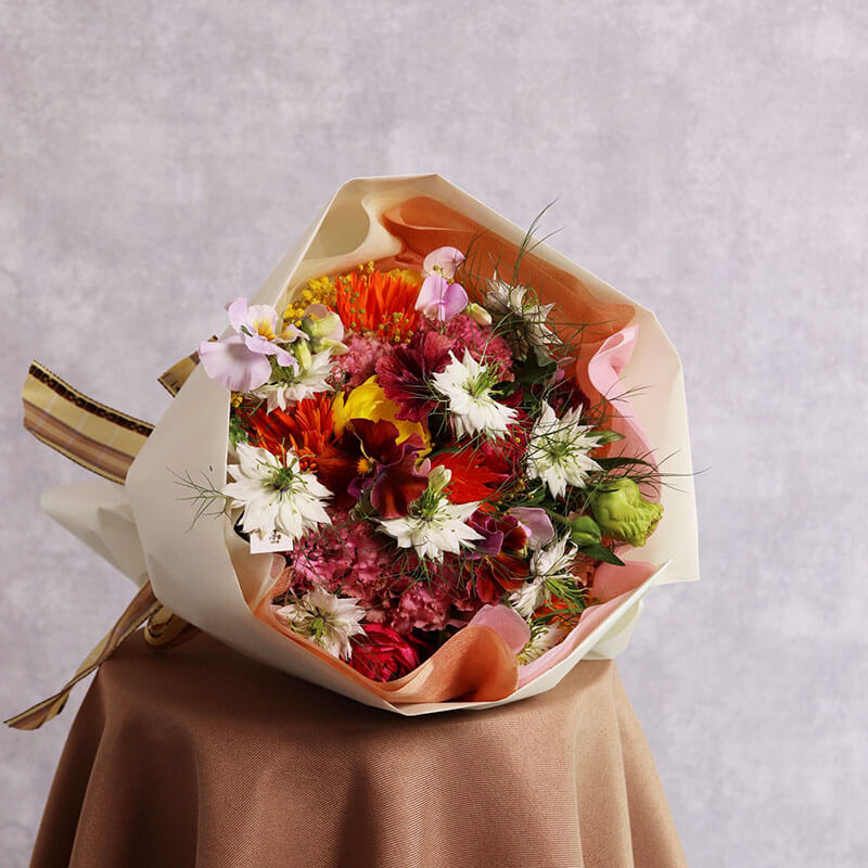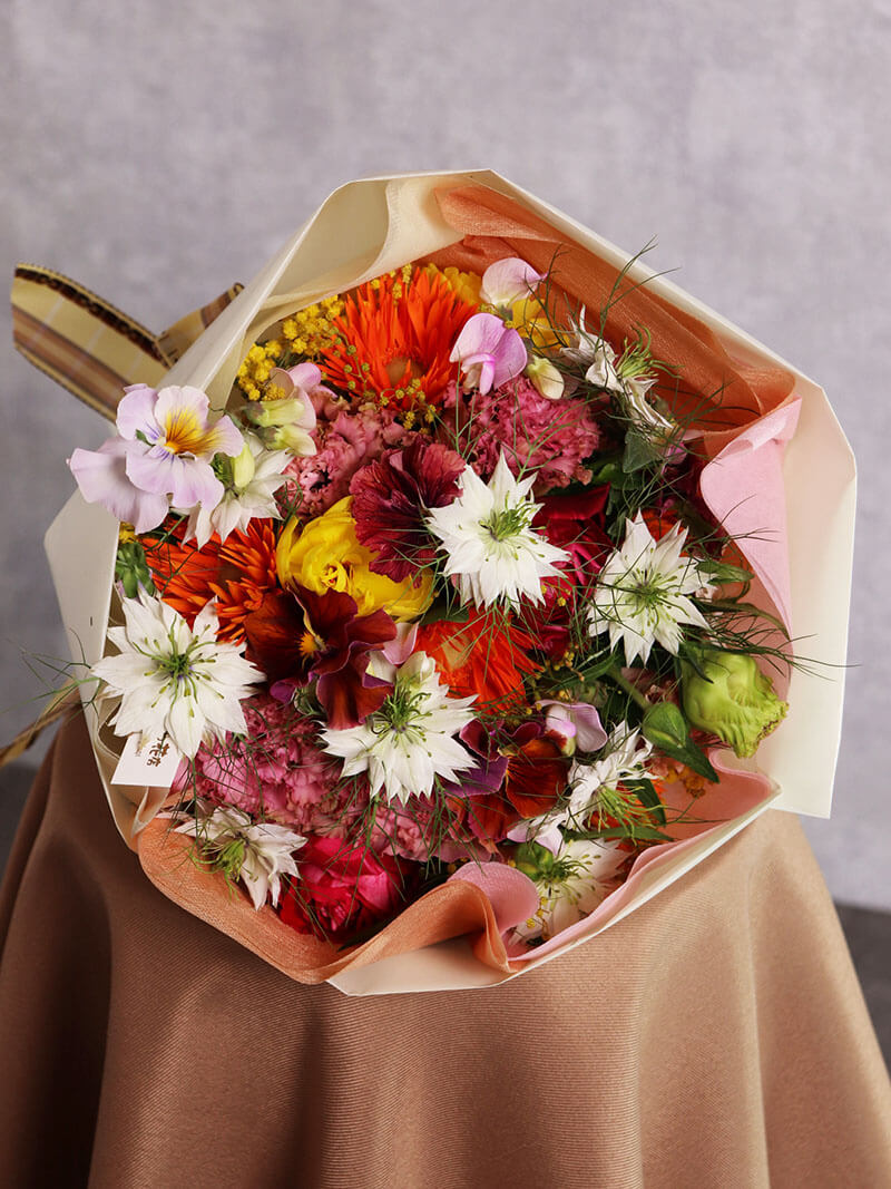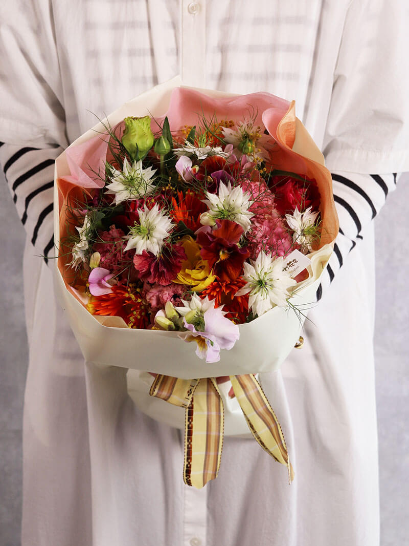 *お届け日はご希望としての承りとし、災害等の影響で遅延が生じる場合があることをご了承の上でご注文ください。 *一部地域への配送はご希望日時に添えない場合もあることをご了承ください。 *送料・決済方法・不在時対応等について、ご注文前にご利用案内をご一読・ご理解の上、ご注文ください。 *使用する花は、季節により発色や大きさが写真と異なる場合がございます。また、天候や仕入れの状況により変更する場合もありますが、ボリューム感や雰囲気は掲載写真にそうよう配慮いたします。花の仕入れは制作・発送の直前に決定するため、花の内容変更について事前にご連絡をすることが難しい場合があることを予めご了承ください。 *商品によっては、時期により仕入れ不可能な場合がございます。その際、速やかに弊社よりご連絡させていただきます。 *商品に納品書(商品の価格が記載されたもの)は一切同梱いたしません。 *領収書をご入用の際は、マイページの注文履歴より表示できます。 *1回のご注文でお届けできる住所は1箇所のみです。 *お届け先の住所が複数の場合は別々にご注文ください。