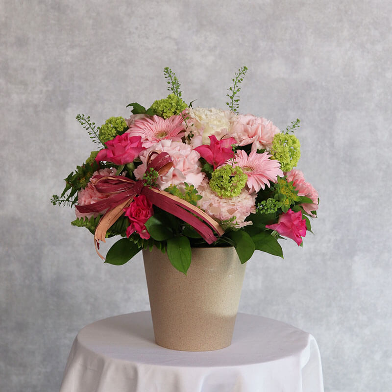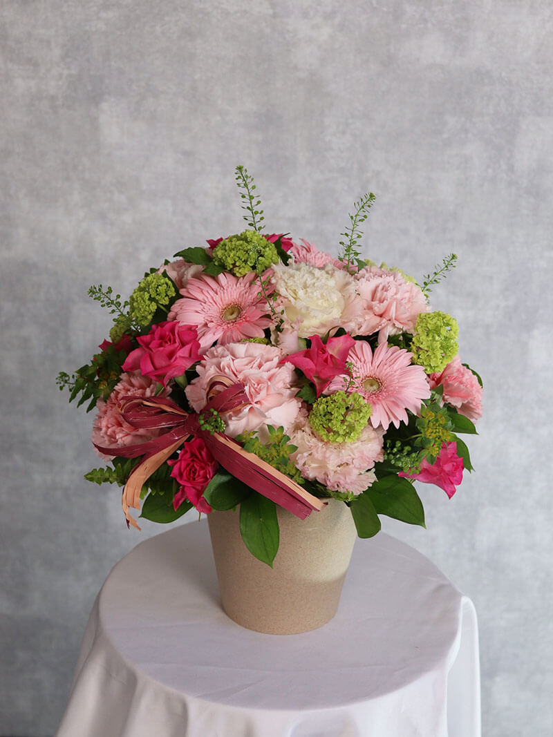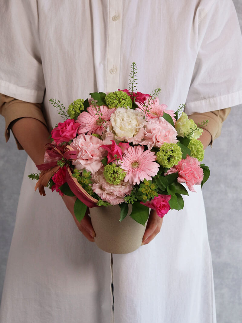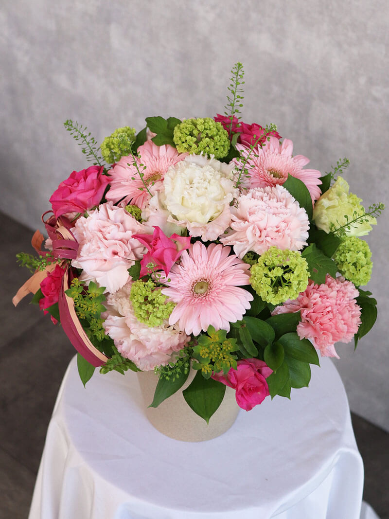 母の日にぴったりの、ピンクを基調とした華やかで可愛らしいアレンジメントです。派手すぎず洗練された色合いは、誕生日や記念日、贈り物はもちろん、ご自宅用のインテリアにもおすすめです。東広島市の花屋「ますかわ花店」が心を込めてお作りいたします。生花を使用しているため、季節ごとの旬のお花で仕上げるため、掲載写真とは花材が異なる場合がございます。ご了承ください。