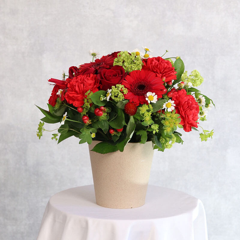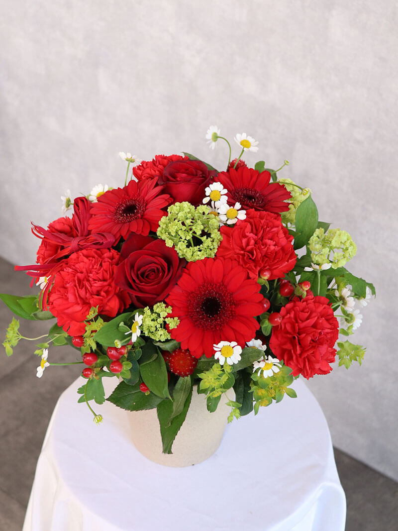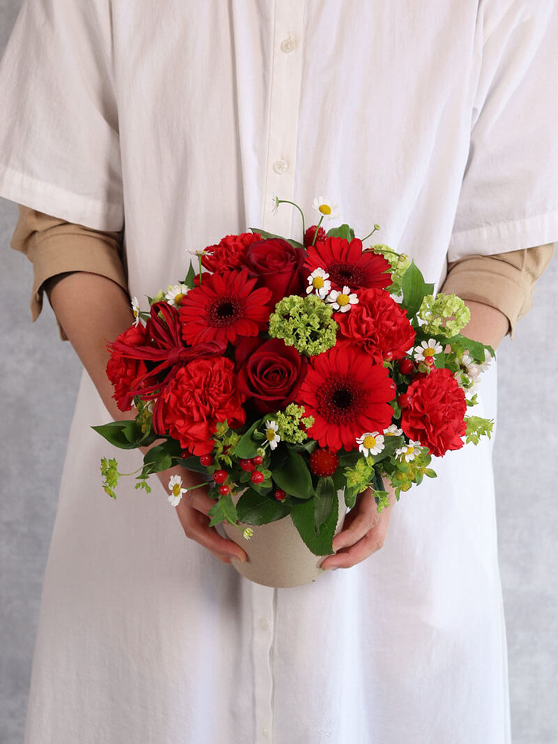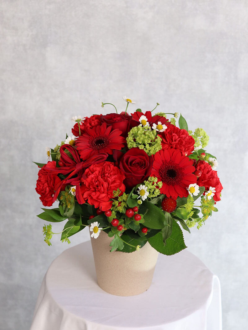 母の日にぴったりの、赤を基調とした華やかで可愛らしいアレンジメントです。華やかに洗練された色合いは、誕生日や記念日、贈り物はもちろん、ご自宅用のインテリアにもおすすめです。東広島市の花屋「ますかわ花店」が心を込めてお作りいたします。生花を使用しているため、季節ごとの旬のお花で仕上げるため、掲載写真とは花材が異なる場合がございます。ご了承ください。