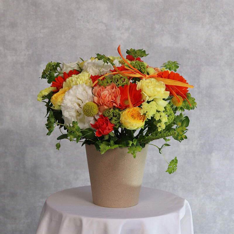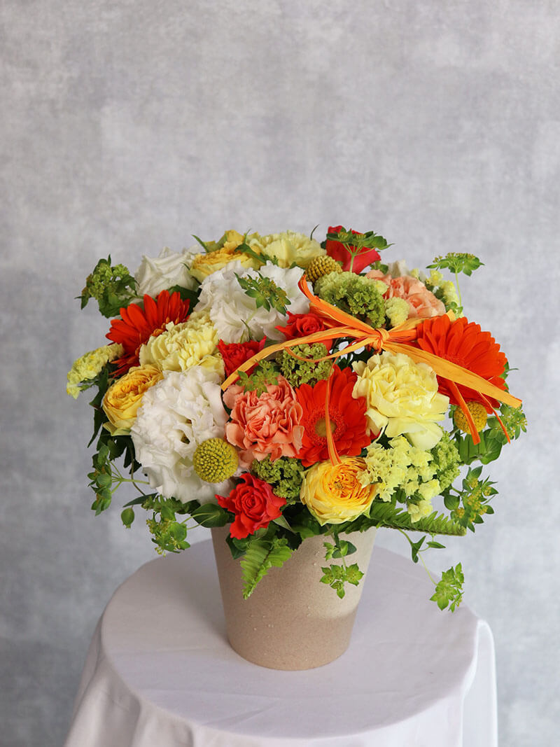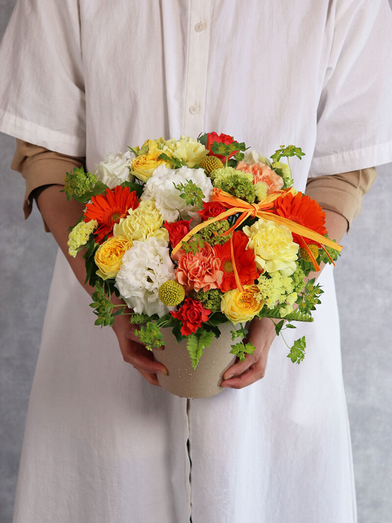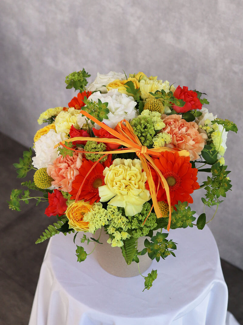 母の日にぴったりの、黄色オレンジを基調とした華やかで可愛らしいアレンジメントです。派手すぎず洗練された色合いは、誕生日や記念日、贈り物はもちろん、ご自宅用のインテリアにもおすすめです。東広島市の花屋「ますかわ花店」が心を込めてお作りいたします。生花を使用しているため、季節ごとの旬のお花で仕上げるため、掲載写真とは花材が異なる場合がございます。ご了承ください。