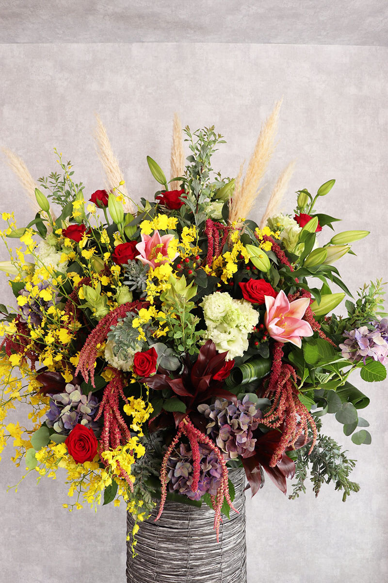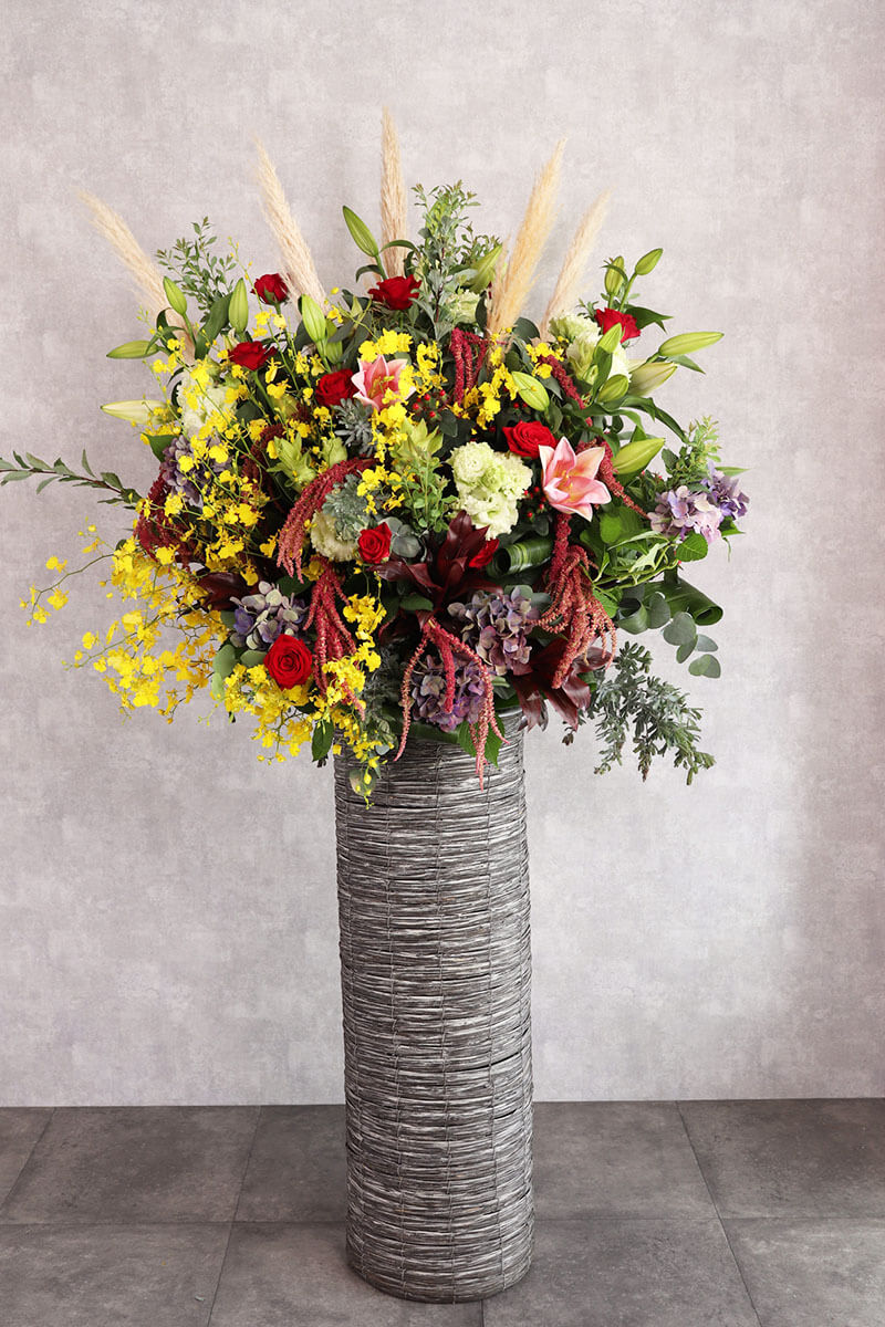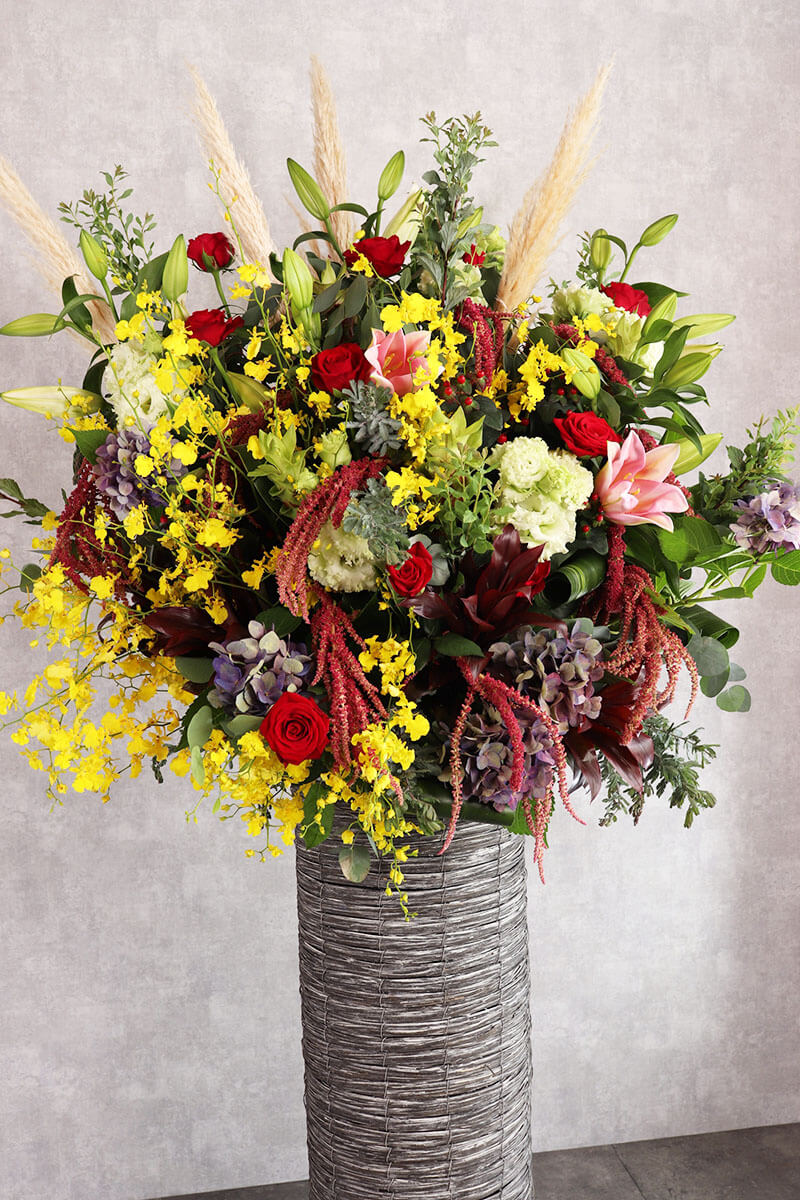 華やかさとボリューム感を兼ね備えたおまかせスタンド花。高さのあるデザインが空間を彩り、特別なシーンをより一層引き立ててくれます。開店祝い、発表会、公演祝いなど、幅広いシーンに最適。存在感のある豊かなボリューム感で、大切な方への気持ちを華やかに表現してくれます。東広島市のますかわ花店が心を込めてお届けいたします。