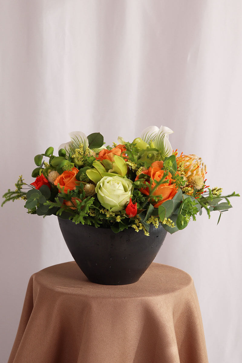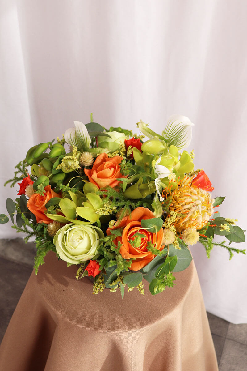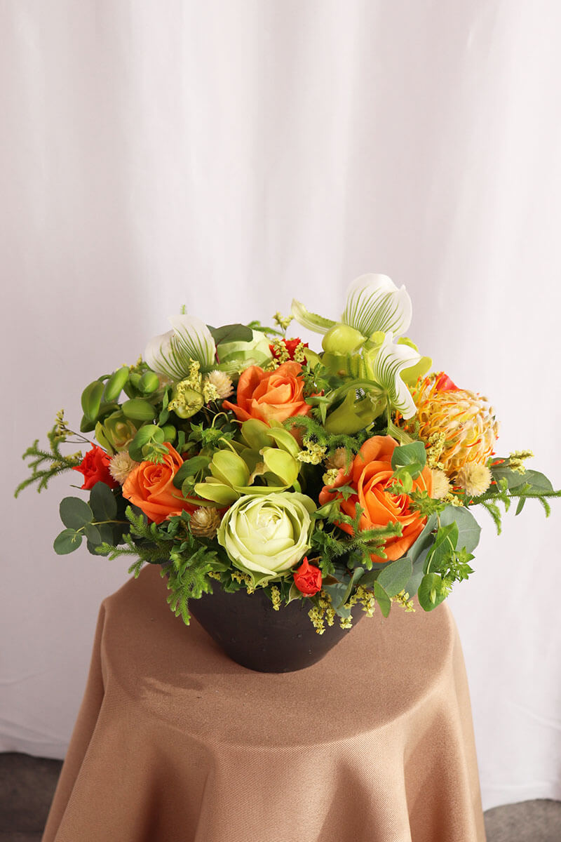 東広島市の花屋「ますかわ花店」が季節感あふれるオレンジ・グリーン系で上品にまとめた、ギュッとお花を詰め込んだコンパクトサイズのアレンジメントです。明るいオレンジの彩りと、みずみずしいグリーンのコントラストが華やかさと温かみを演出し、贈り物にもご自宅のインテリアにもぴったり。季節の表情を大切にしながら、バランスよく立体感のあるデザインに仕上げています。気軽に飾れるサイズながら存在感があり、どんなシーンにも優しく彩りを添える一品です。