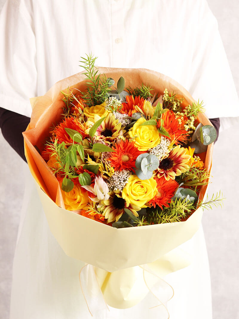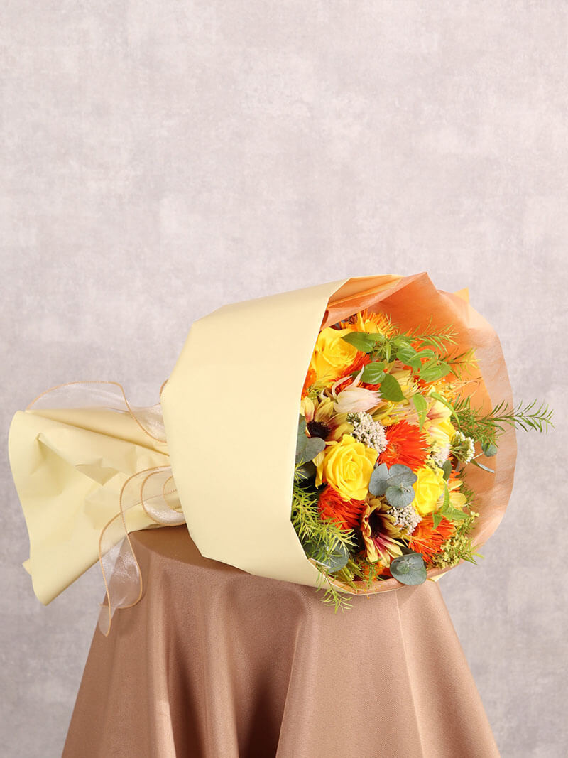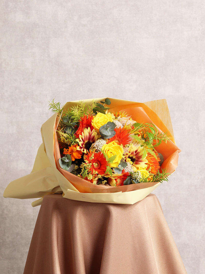 明るく心温まる印象の、暖色系でまとめた季節のおまかせブーケです。オレンジやイエローを中心にした彩りは心も温まり、贈る方・受け取る方の気持ちを優しく包み込みます。誕生日や記念日、お祝いのシーンにぴったりの華やかさ。季節感を大切に、東広島市の花屋「ますかわ花店」が一つひとつ丁寧にお作りします。※季節の花を使い暖色系で制作いたします