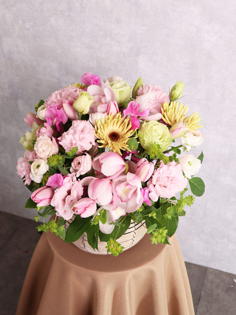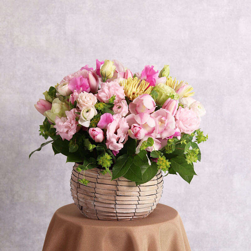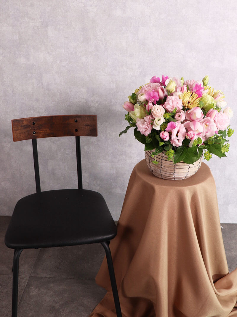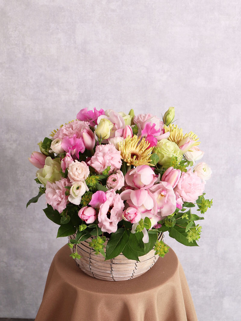 やさしいピンクを基調に、春の訪れを感じさせる淡色でまとめた上品なフラワーアレンジメントです。ふんわりとした色合いが空間を明るく彩り、贈る方の気持ちをやさしく伝えます。お誕生日や記念日、季節のご挨拶にもおすすめ。東広島市の花屋・ますかわ花店が、ひとつひとつ丁寧に心を込めてお作りし、新鮮な状態でお届けします。※淡いピンクのお花を入れてイメージ画像のように可愛く制作いたします